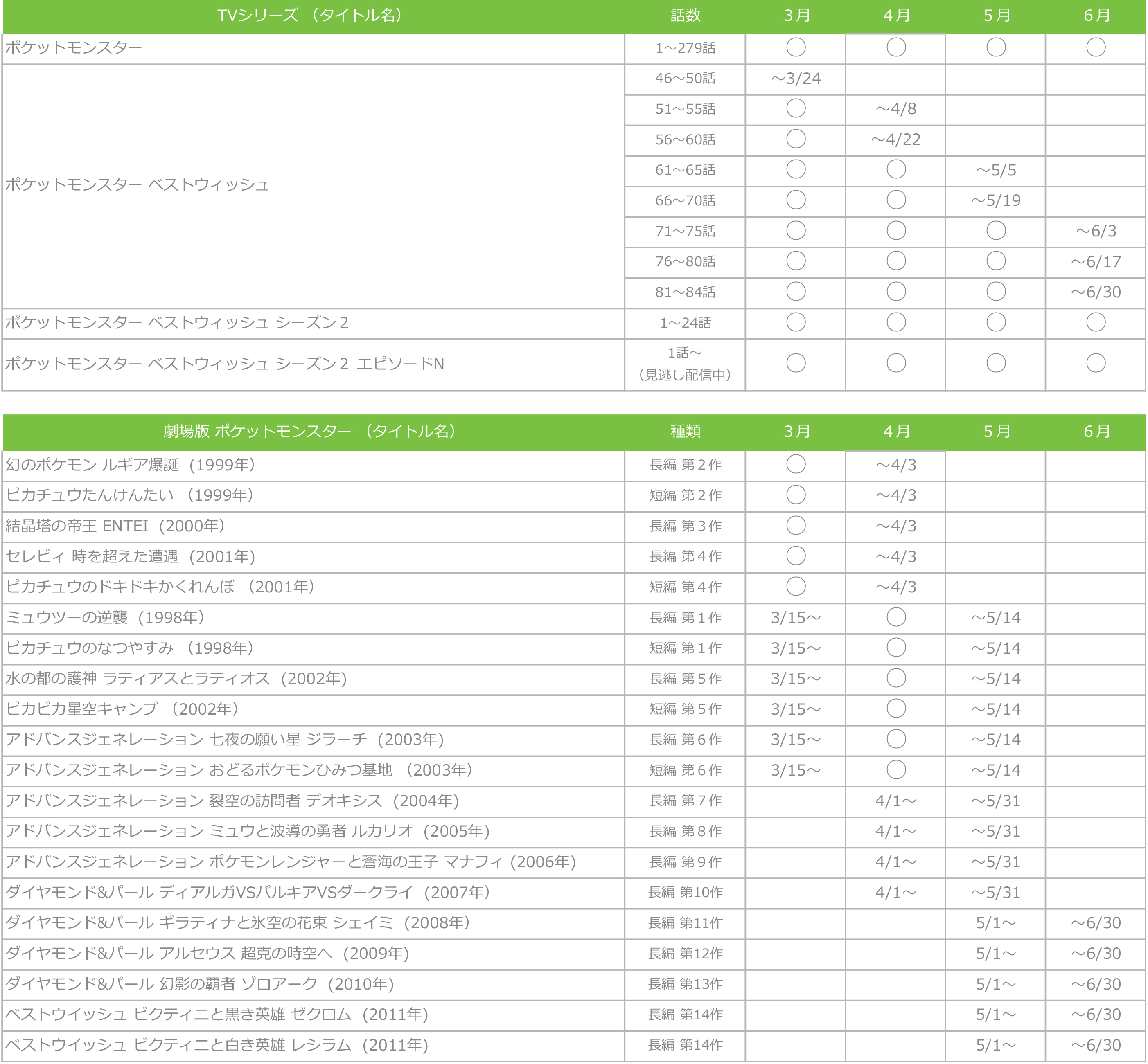 「ポケットモンスター」テレビ番組・映画 配信カレンダー 2013.03.07 2013年3月~5月の「ポケットモンスター」テレビ番組・映画の配信スケジュールをご案内します。○印のついている月が配信月です。月中に配信開始・終了する場合は、各作品のメモ欄に記載しております。どうぞお楽しみください。 Tweet