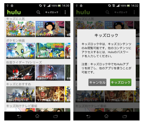 先日iPad用のHulu アプリに加わった「キッズロック」機能がアンドロイド端末向けのアプリにも搭載されます。アンドロイドスマートフォンおよびタブレットでもご安心してお子さまにHuluをお楽しみいただけます。