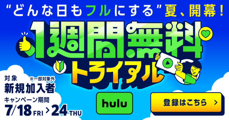 Huluの見放題サービスを新規で会員登録をして頂いた方(一部対象外*)に、入会日より1週間無料トライアルを付与いたします。