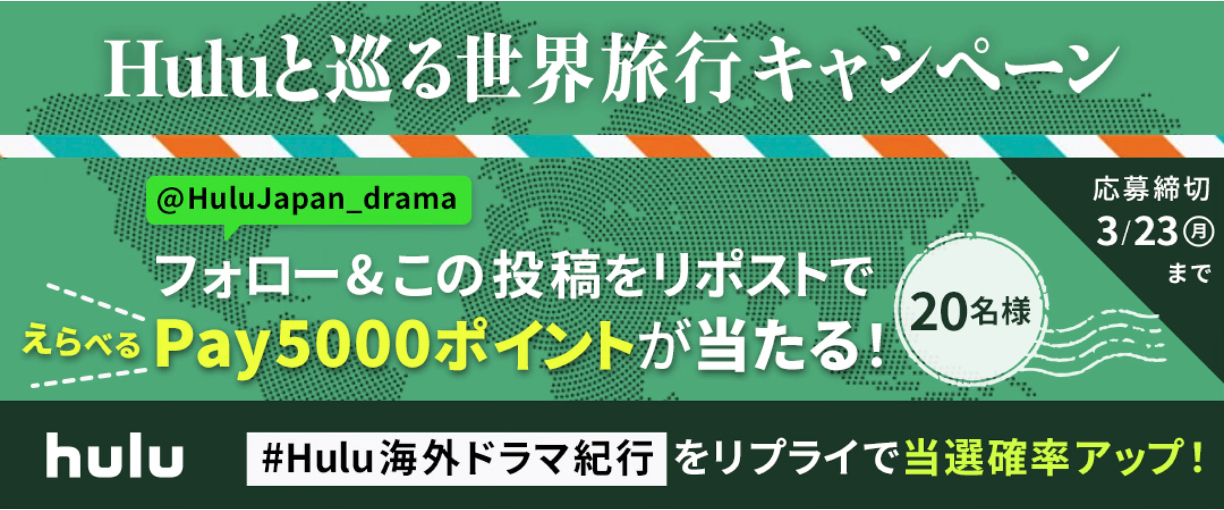 Huluと巡る世界旅行キャンペーン フォロー&リポストでえらべるPay5000ポイントが当たる!