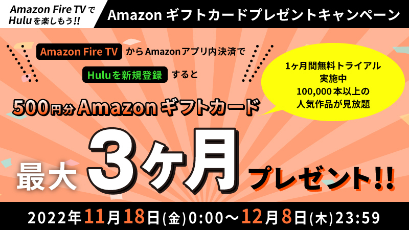 2022年11月18日(金)0:00から2022年12月8日(木)23:59まで、Hulu1ヶ月無料トライアル後、ご利用継続で毎月500円分のAmazonギフトカードの最大3ヶ月プレゼントキャンペーンを実施いたします。