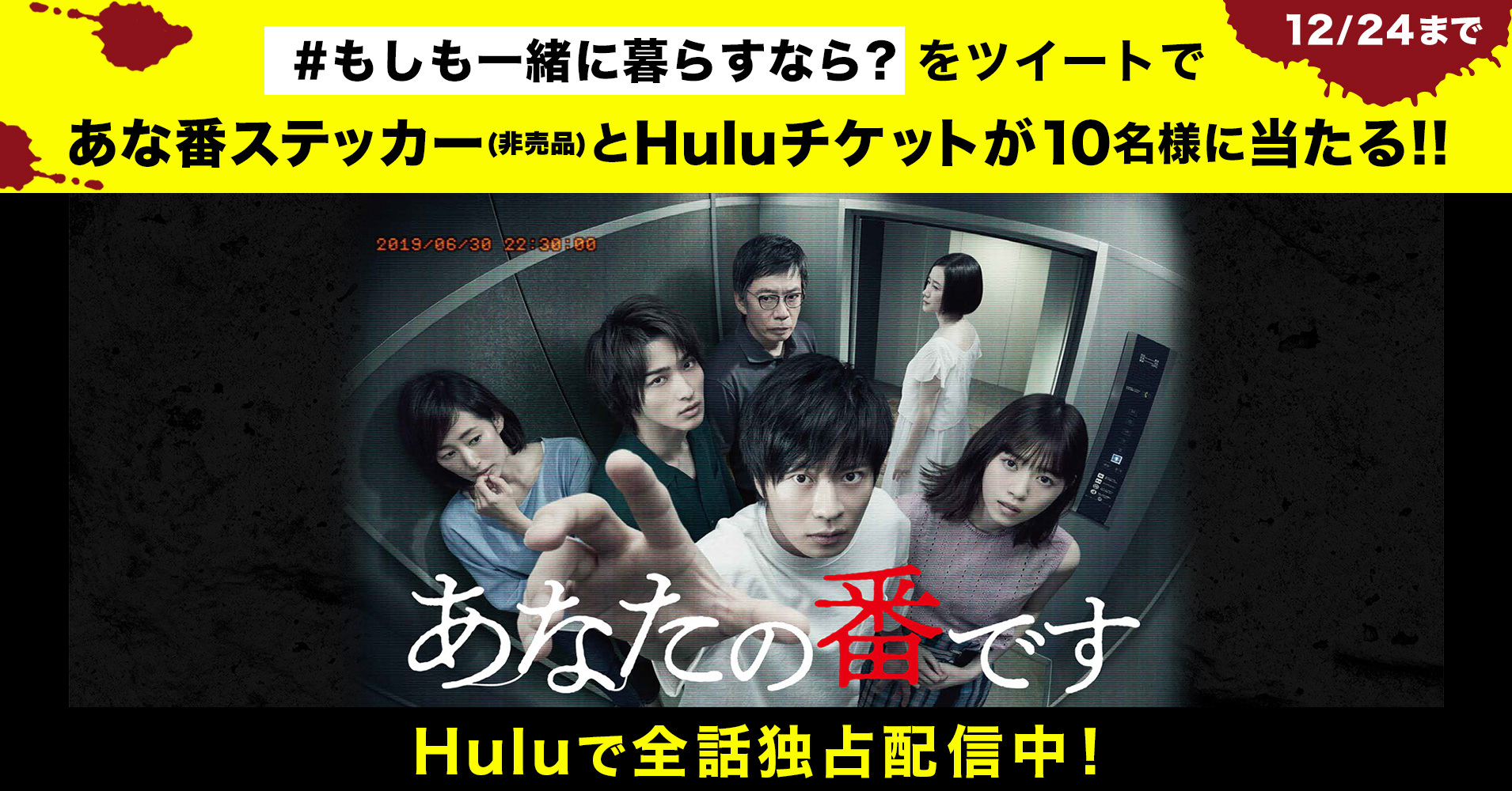 現在全国の劇場で公開中の『あなたの番です 劇場版』。Huluではドラマ「あなたの番です」を全20話のほか、Huluオリジナルストーリー「扉の向こう」や番外編「過去の扉」なども独占配信中です。そしてHuluの公式Twitterでは「#もしも一緒に暮らすなら? あな番プレゼントキャンペーン」を実施、抽選で10名様に「あな番ステッカー(非売品)」と「Huluチケット(1ヵ月無料)」をセットでプレゼントいたします。奮ってご応募ください。