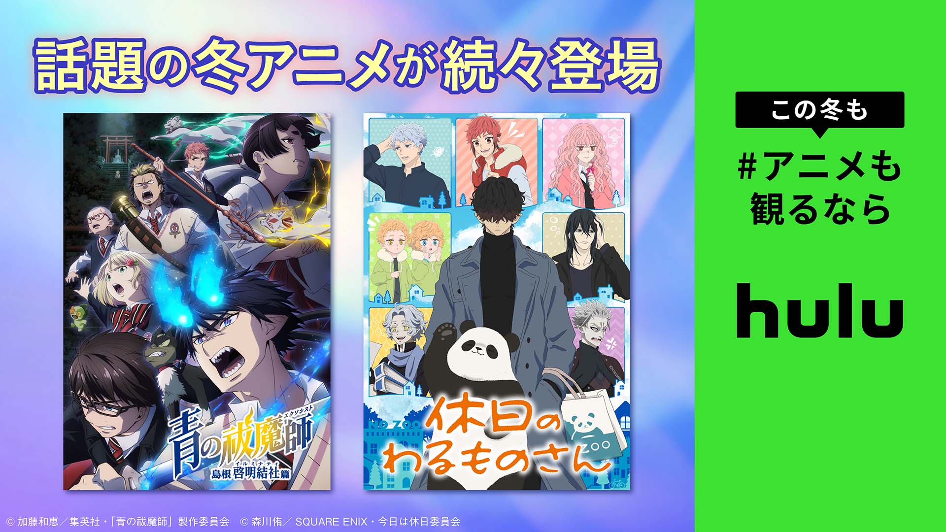 注目は、1月7日(日)1:00〜配信の「青の祓魔師 島根啓明結社篇」、そして1月8日(月)2:05〜配信の「休日のわるものさん」。「青の祓魔師 島根啓明結社篇」は大人気TVアニメシリーズの約7年ぶりの最新作で、魔神サタンの落胤(らくいん)という運命を背負った主人公が双子の弟や仲間たちとともに悪魔を祓う祓魔師を目指す物語。「休日のわるものさん」は、地球侵略を目論む悪の組織で”将軍”と呼ばれ、地球防衛組織「レンジャー」と日々死闘を繰り広げている主人公が、日々の激務に疲れた心身を癒すべく完全オフモードで充実した休日を過ごす日常を描く心癒されるヒーリングコメディです。それぞれ地上波放送終了後から、Huluにて見放題最速で先行配信いたします。