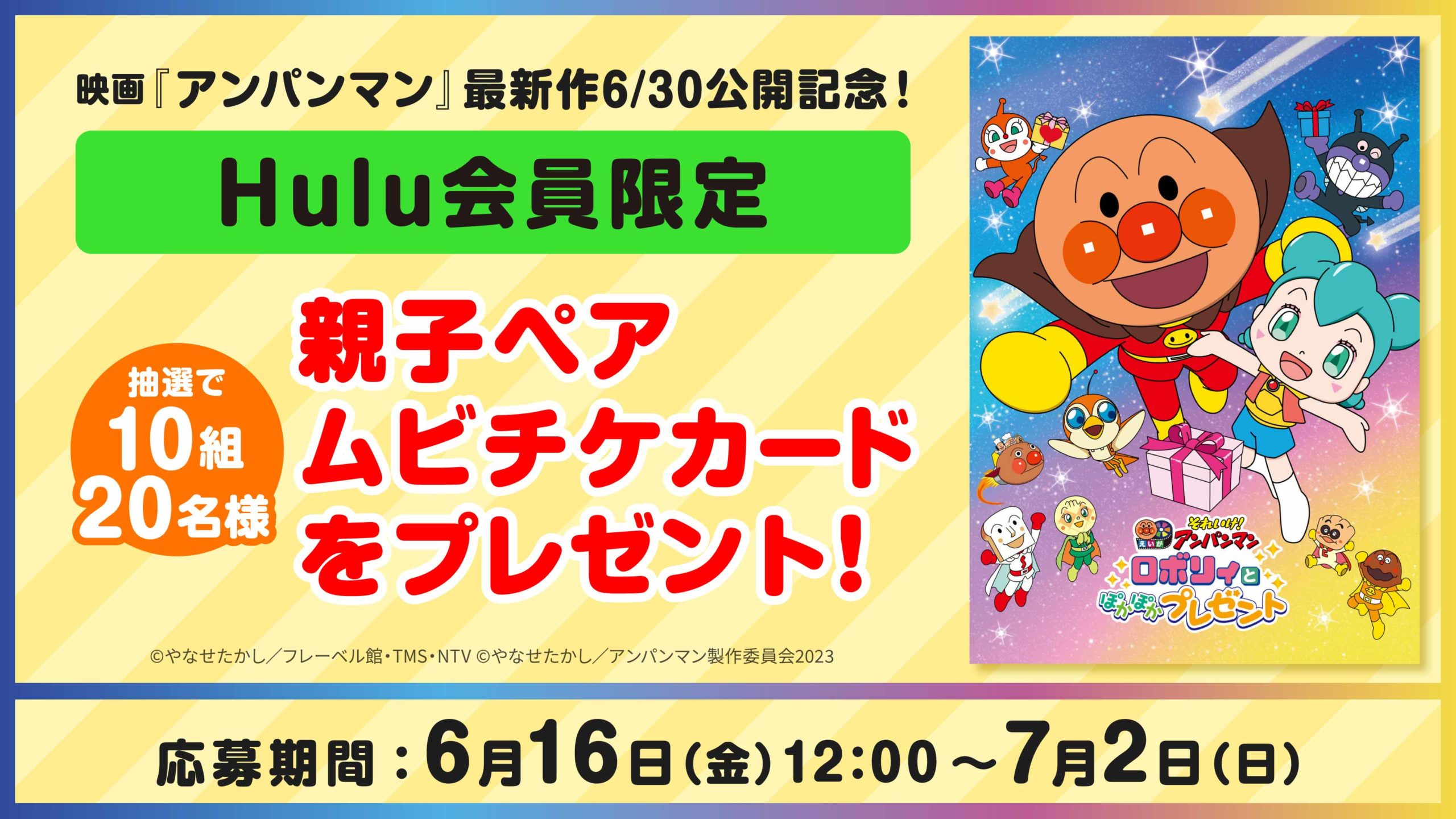 映画「アンパンマン」最新作6/30公開を記念して、Hulu会員限定で「それいけ!アンパンマン ロボリィとぽかぽかプレゼント」のムビチケ(親子ペア券)を抽選で10組20名様にプレゼントします!奮ってご応募ください。