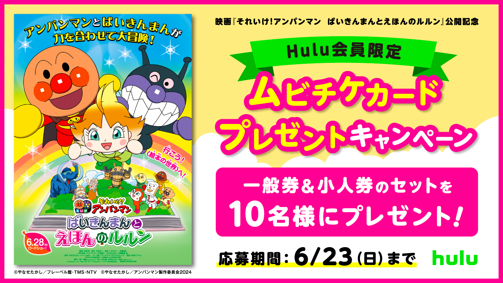 映画『アンパンマン』最新作の6月28日(金)公開を記念して、Hulu会員限定で映画『それいけ!アンパンマン ばいきんまんとえほんのルルン』のムビチケカード(一般券・小人券セット)を抽選で10名様にプレゼントします!奮ってご応募ください。