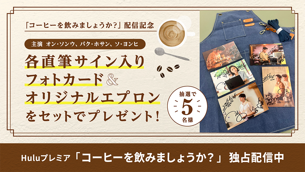 2月4日(金)から、韓国ドラマ「コーヒーを飲みましょうか?」の独占配信がスタートしました。これを記念して、豪華キャストの直筆サイン入りフォトカードとオリジナルエプロンが当たるプレゼントキャンペーンを実施いたします。