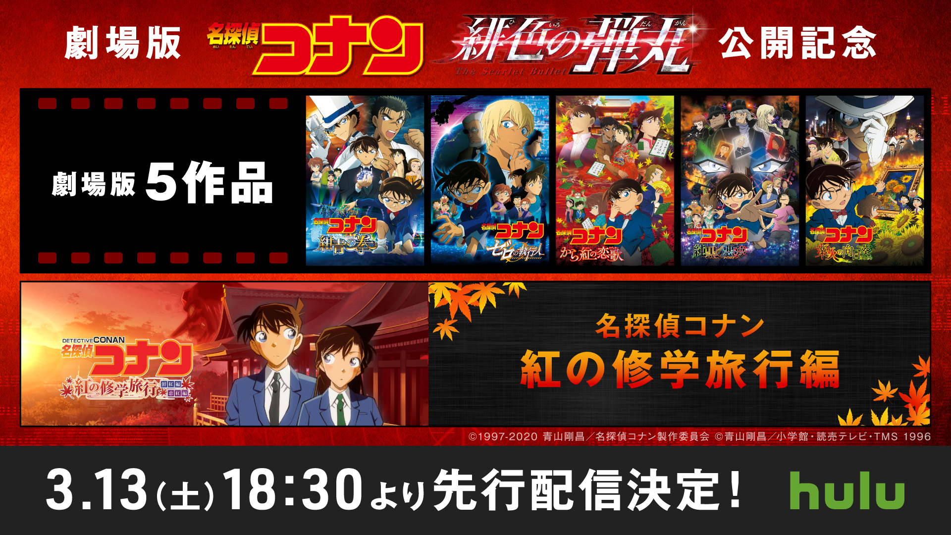 2021年4月16日(金)から公開される、第24弾 劇場版 『名探偵コナン 緋色の弾丸』の公開を記念して、Huluでは、第23弾 劇場版『名探偵コナン 紺青の拳 (フィスト)』をはじめとした歴代の劇場版5作品と新一と蘭の恋の行方が描かれる“胸キュン必須”のTVアニメーションスペシャル「紅の修学旅行編」を3月13日(土)18:30から先行配信します。「紅の修学旅行編」は動画配信サービスで初の配信となります。