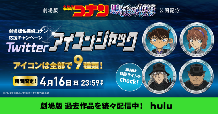 「名探偵コナン」の視聴をさらに盛り上げる施策として、Hulu公式Twitter(@hulu_japan)では、“劇場版名探偵コナン応援キャンペーン”と題して、Twitterアイコンジャックを本日よりスタート!(2023年4月16日(日)までの期間限定)