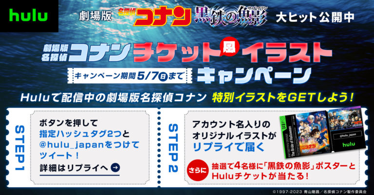 さらに、Huluで配信中の劇場版第1弾から第25弾までのポスタービジュアルが入った“チケット風イラスト(全25種類)”がもらえるキャンペーン(https://news.hulu.jp/conan_twitterticketcp/)も本日よりスタート。指定のハッシュタグ2つと、「@hulu_japan」をつけてツイートすると、自分のTwitterアカウント名が入ったオリジナルイラストがリプライで届きます。何度でも参加でき、25作品分コンプリートも可能!お気に入りの作品を指定することもでき、楽しみ方は自由自在!映画と一緒に楽しめる仕掛けになっています。