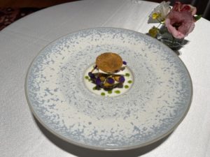 そして、特別なコラボメニューが紹介されました。山下が秋の旬な食材をリクエストし、マルタンシェフのアイデアで生まれたものです。キャラメリゼの下にムール貝とフランス産のポルチーニ茸、酸味のきいたフレッシュチーズ、食用花が挟まれた独創的な料理は、山下によって「海と山の花の雫」と名付けられました。