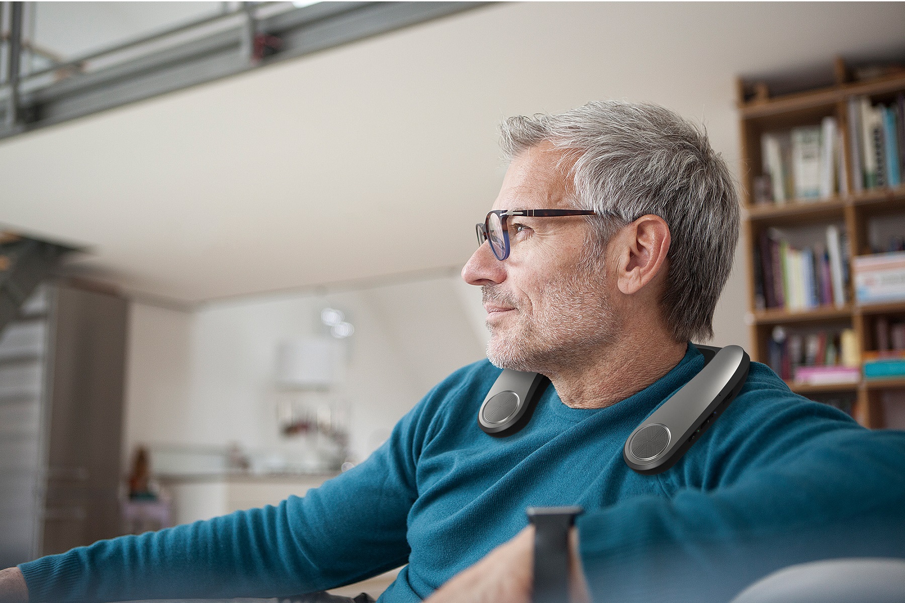 「AQUOSサウンドパートナー AN-SX7A」は、首に掛けて装着し、周囲の音を遮ることなくワイヤレスでテレビの音声やスマートフォンの音楽を耳元で聴くことができるオーディオ機器です。迫力の重低音を実現する独自技術「ACOUSTIC VIBRATION SYSTEM」を搭載し、臨場感あふれるサウンドをお楽しみいただけます。