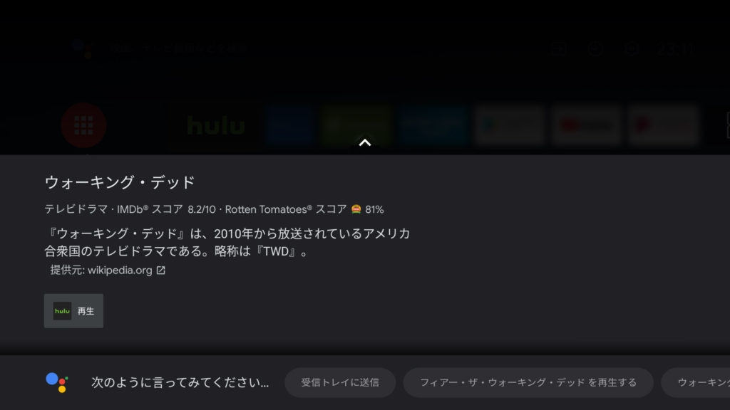 Googleアシスタントではリモコンのマイクボタンを押して話しかけるだけで作品の検索ができますが、この度Huluもその音声検索に対応いたしました。視聴したい作品がHuluで配信中の場合、Android TVの検索結果にHuluのボタンが表示され、クリック1つで再生画面に移動します。