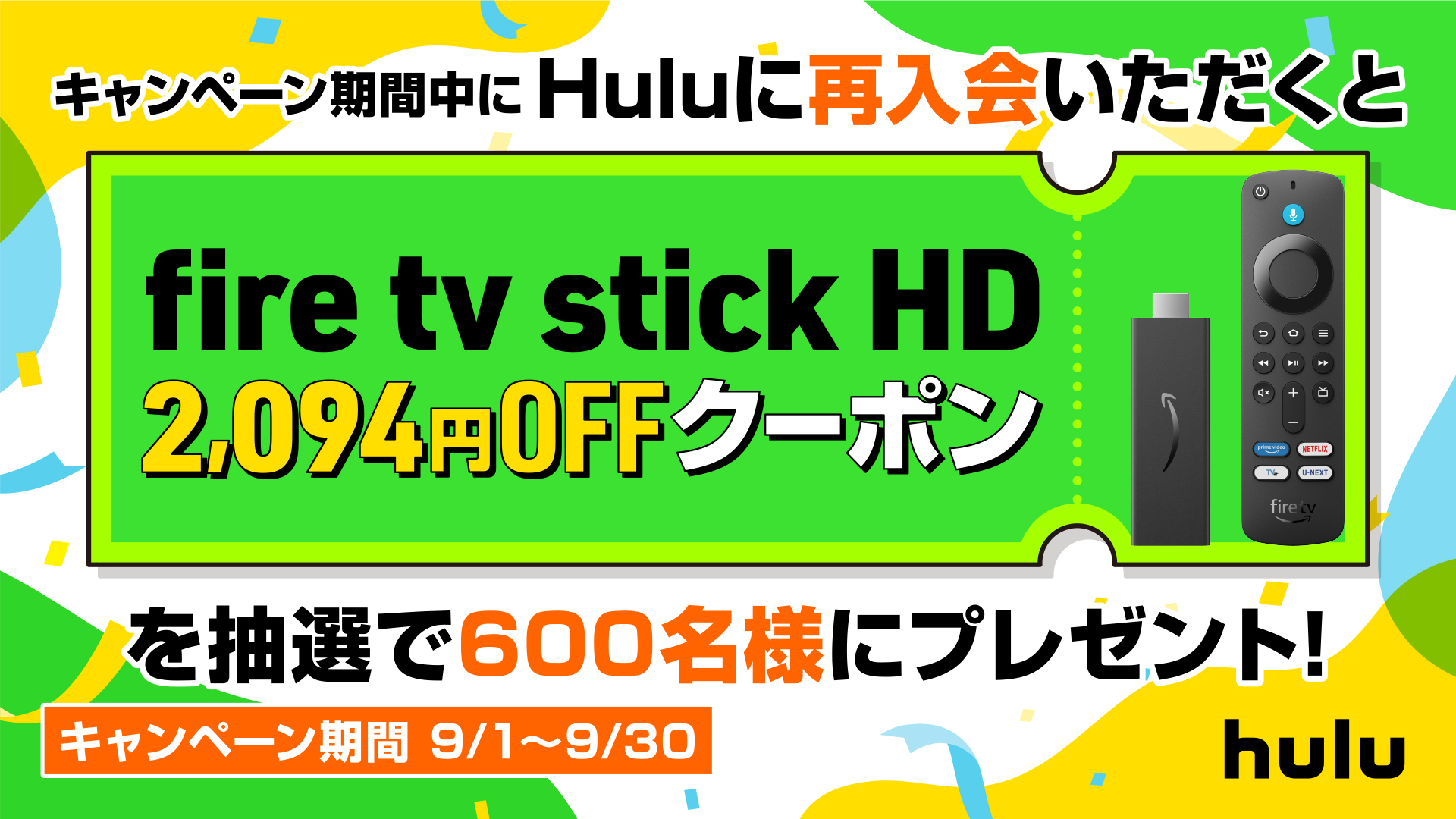 Amazon Fire TV Stick HD 2,094円OFFクーポンが当たる! Hulu再入会キャンペーン実施中
