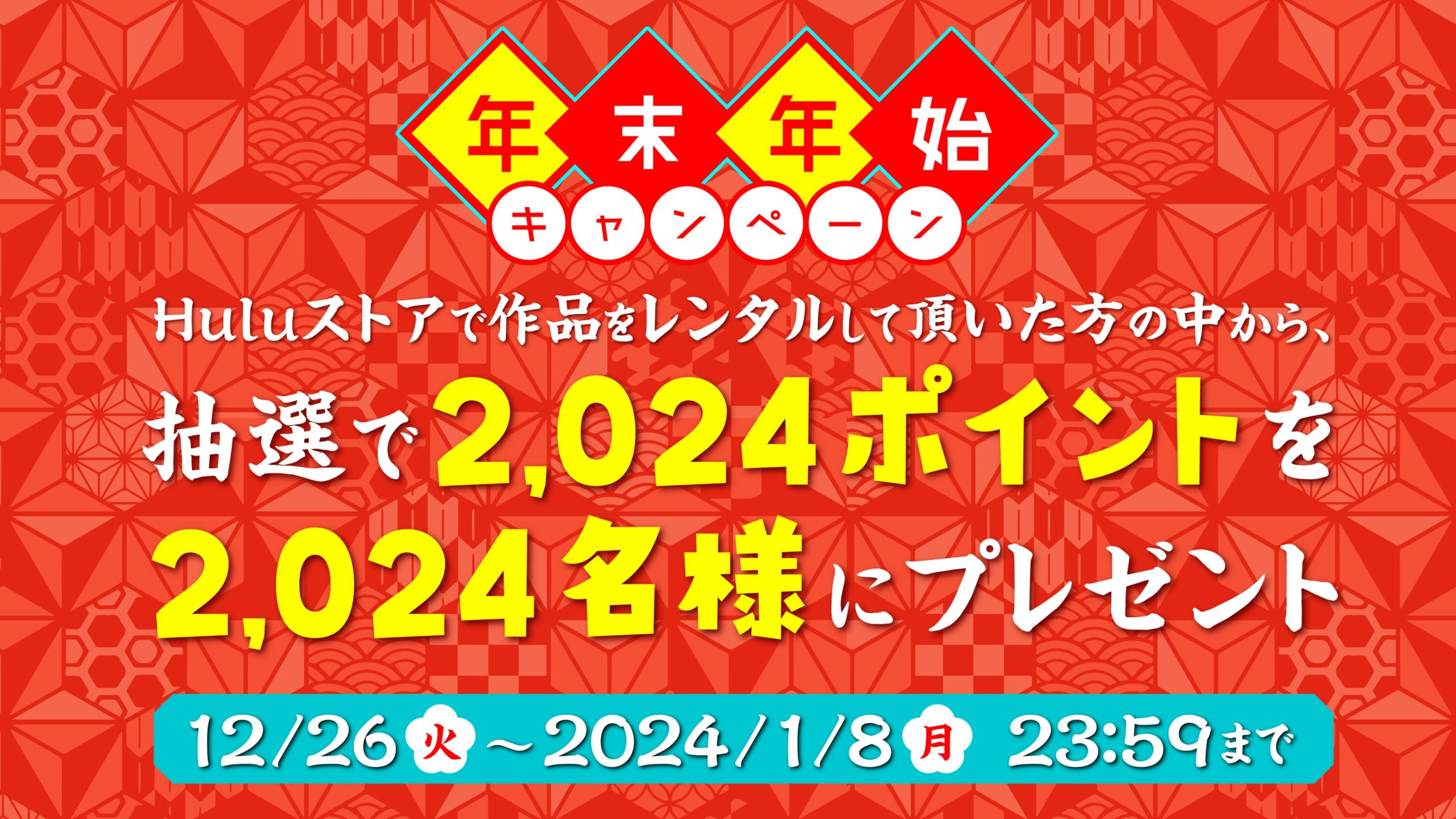 キャンペーン期間中にHuluストアで作品をレンタルして頂いた方の中から、抽選で2,024名様にHuluストアで利用できる期間限定ポイント2,024ポイントをプレゼント。