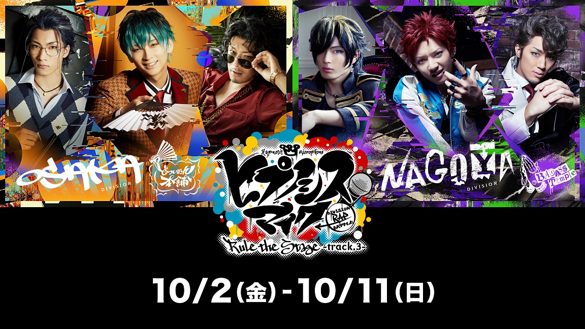 『ヒプノシスマイク-Division Rap Battle-』Rule the Stage -track.3- 10月11日(日)18:00開催の”千秋楽”視聴チケットを「Huluストア」でご購入いただき、ご応募いただいた方を対象に、オオサカ・ディビジョン、ナゴヤ・ディビジョンキャスト全員のサイン入りポスターを抽選で3名様にプレゼントいたします。