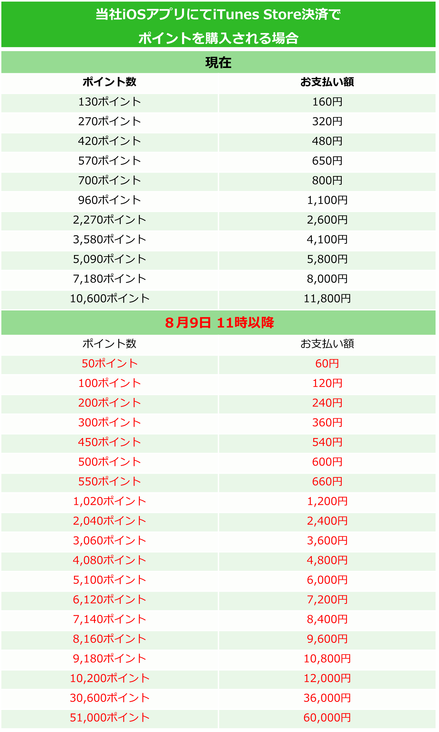 8月9日 11:00より、Appleの価格表変更に基づき、iOSアプリにてポイントをご購入される際の価格を、下表に改定します。