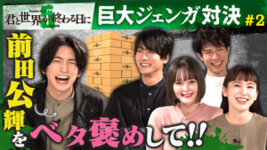 大好評のHulu公式YouTube特別企画「超高層タワーの激闘!巨大ジェンガ対決!」#2がいよいよ公開です!前回に引き続き、ジェンガに書かれたお題に沿ってトークを繰り広げる本企画。今回は、溝端淳平が前田公輝をベタ褒め⁉さらに、まさかのエピソード番外編で飯豊まりえから撮影現場でおきた、とんでも事件が語られます!「1週間後ゾンビになったら最後になにをする?」のお題を引いた前田からは意外にも現実的な回答が…!そして前回と同じく仲良く同じお題を引き当てた玉城と飯豊は「終末世界で仲間にしたいキャラクター」を発表!ここでしか観られない㊙エピソードも盛りだくさんです!ぜひ、ご覧ください!