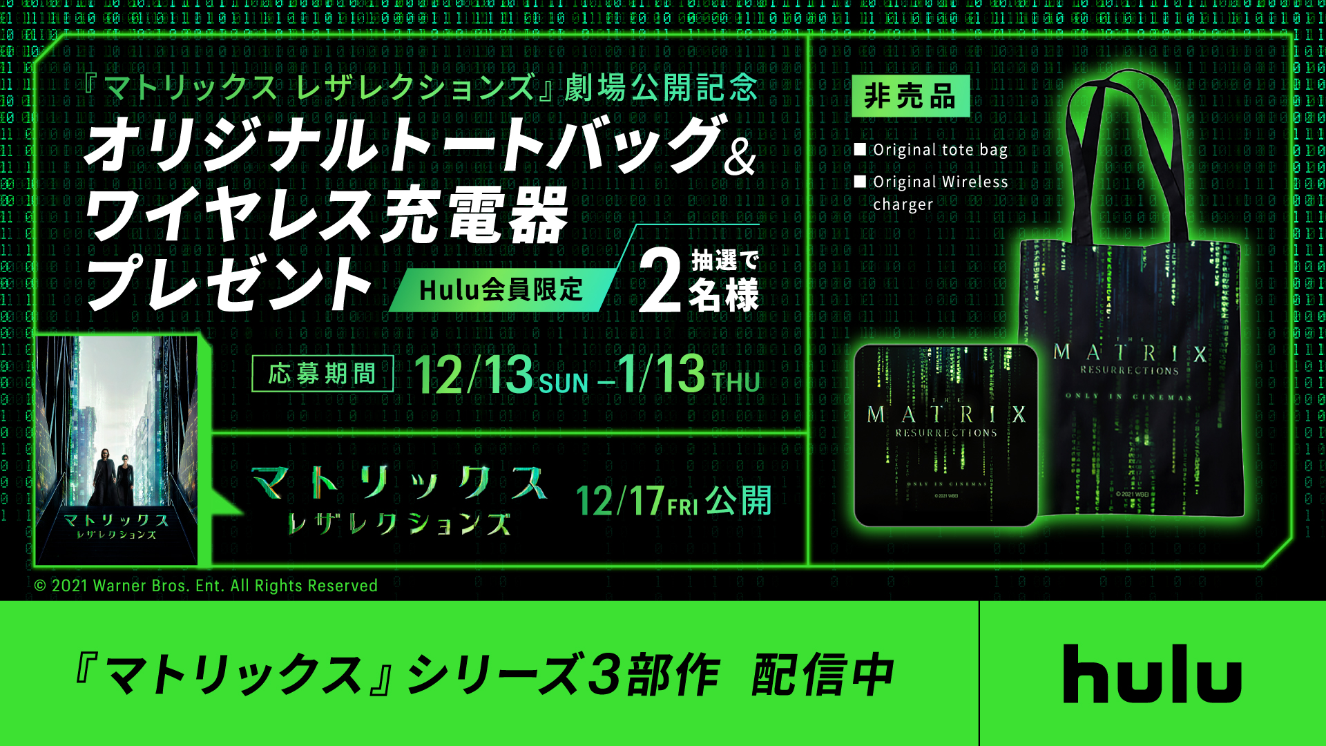 2021年12月17日(金)から映画『マトリックス レザレクションズ』が劇場公開されることを記念して、オリジナルトートバッグとワイヤレス充電器をセットで【Hulu会員限定】2名様にプレゼントします!