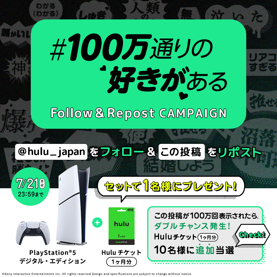 フォロー&リポストで「PlayStation®5」+「Huluチケット(1ヶ月分) 」セットが当たるキャンペーンも同時開催中!