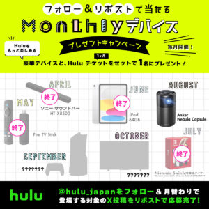 今後も賞品内容を変え、毎月第1水曜日にプレゼントキャンペーンを実施予定です。ぜひHulu公式Xをフォローして、最新情報をご確認ください。