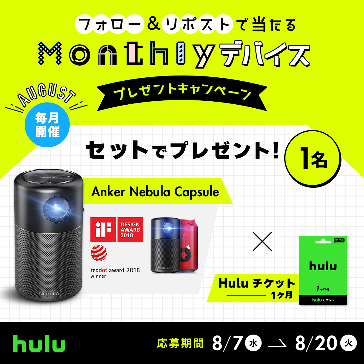 8月の賞品は「Anker Nebula Capsule」公式Xにて毎月プレゼントキャンペーンを開催中|豪華デバイスを当ててHuluをもっと楽しもう!