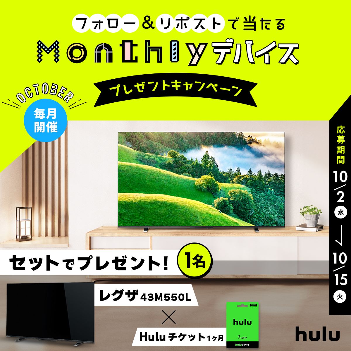 10月の賞品は液晶テレビ「レグザ 43M550L」公式X毎月プレゼントキャンペーン最終回|豪華デバイスを当ててHuluをもっと楽しもう!