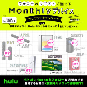 Hulu公式X(旧Twitter)では、抽選でHulu対応デバイスとHuluチケット(1ヶ月分)が当たるキャンペーンを毎月実施中!