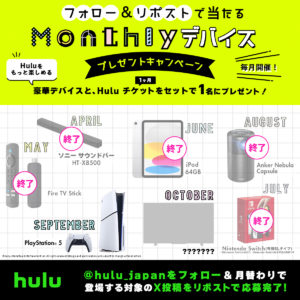 今後も賞品内容を変え、毎月第1水曜日にプレゼントキャンペーンを実施予定です。ぜひHulu公式Xをフォローして、最新情報をご確認ください。