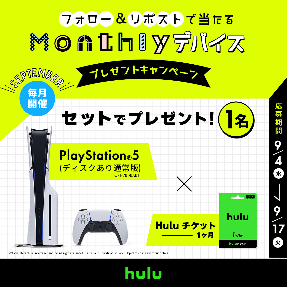 9月の賞品は「PlayStation®5」公式Xにて毎月プレゼントキャンペーンを開催中|豪華デバイスを当ててHuluをもっと楽しもう!