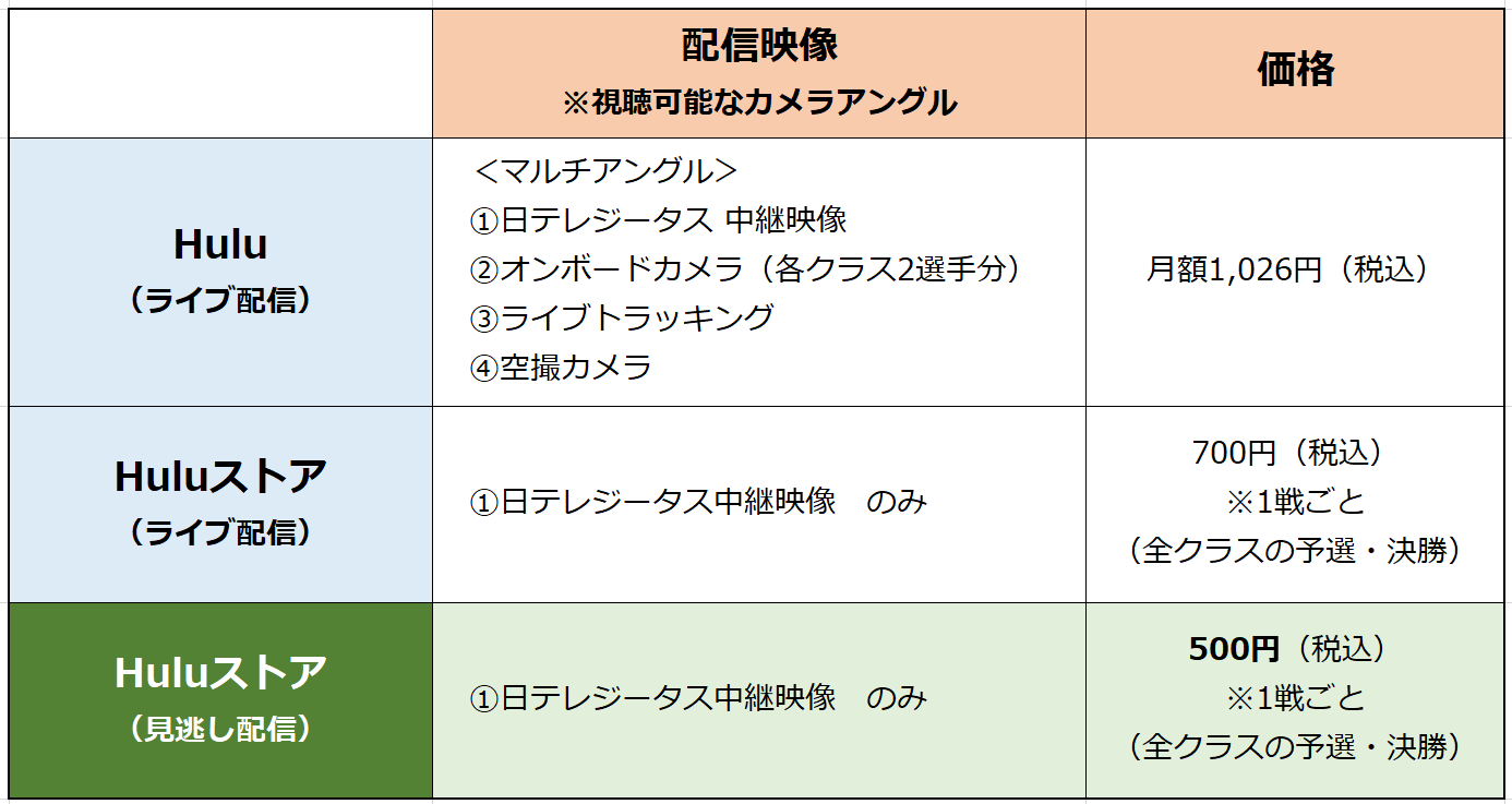 ※今後の各レースにおける見逃し配信の配信開始日・配信期間につきましては、レースごとに異なるため随時「Huluストア」サイト内でご案内いたします。