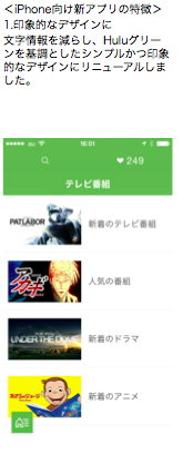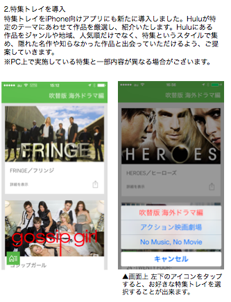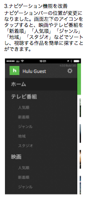 Hulu、iPhone向けアプリを一新 2014.10.03 HuluはiPhone向けのアプリを一新いたしました。AppStoreにてHuluアプリをアップデートしていただくと、新しいユーザーインターフェースにてHuluのサービスをお楽しみいただけるようになります。なお、HuluのiPhone向けアプリはApp Storeで無料でダウンロードすることが可能です。 Tweet