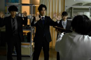 厚労省の槇原を演じます石田剛太です。厚労省チームが同じ劇団のヨーロッパ企画の3人ですので、どうしたって同僚感が出ていると思います。普段劇団ではコメディーを主体にしているのですが、まったくの笑いなしのシーンです。現場で三枝役の佐藤隆太さんと動き方やセリフを相談しながら、とても緊張感のあるシーンに仕上がったかと思います。三枝と厚労省チームの静かなる熱を感じていただければと思います。