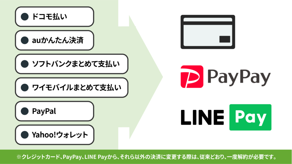 クレジットカード、PayPay、LINE Payであれば解約することなく変更手続きが行えます。