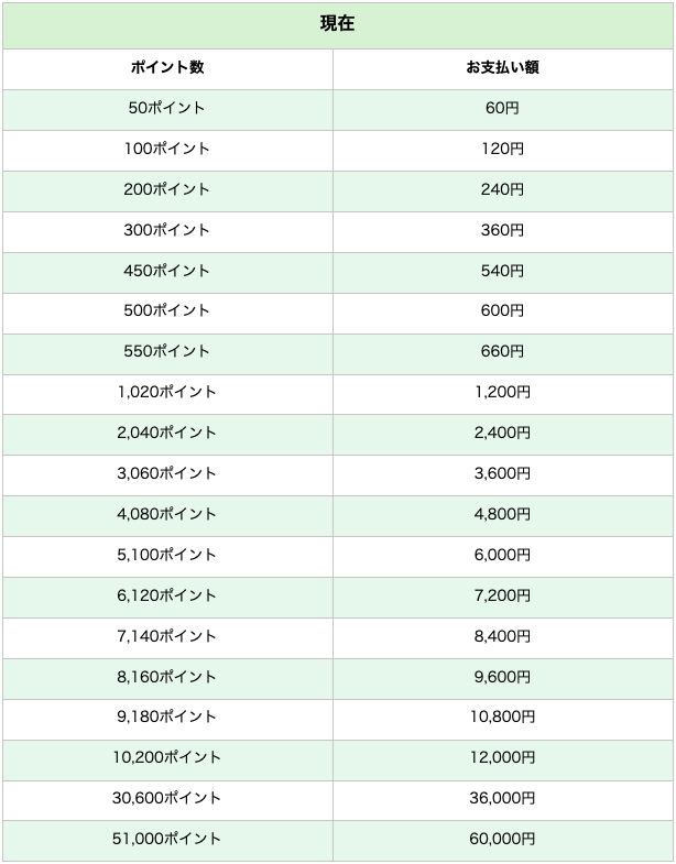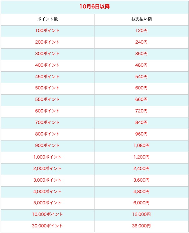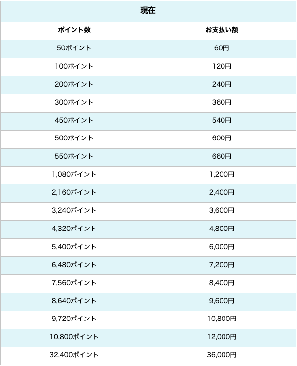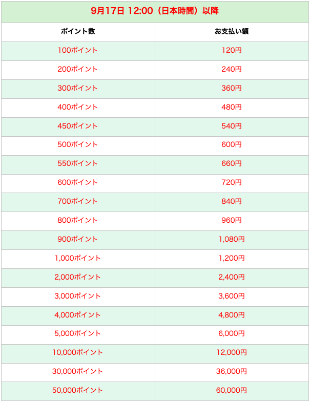 9月17日(水) 12:00(日本時間)以降、当社iOSアプリにてiTunes Store決済、およびAndroidアプリにてGoogle Play決済を用いて「ポイント」をご購入される際の価格を改定いたします。改定後の価格については、以下の表をご参照ください。