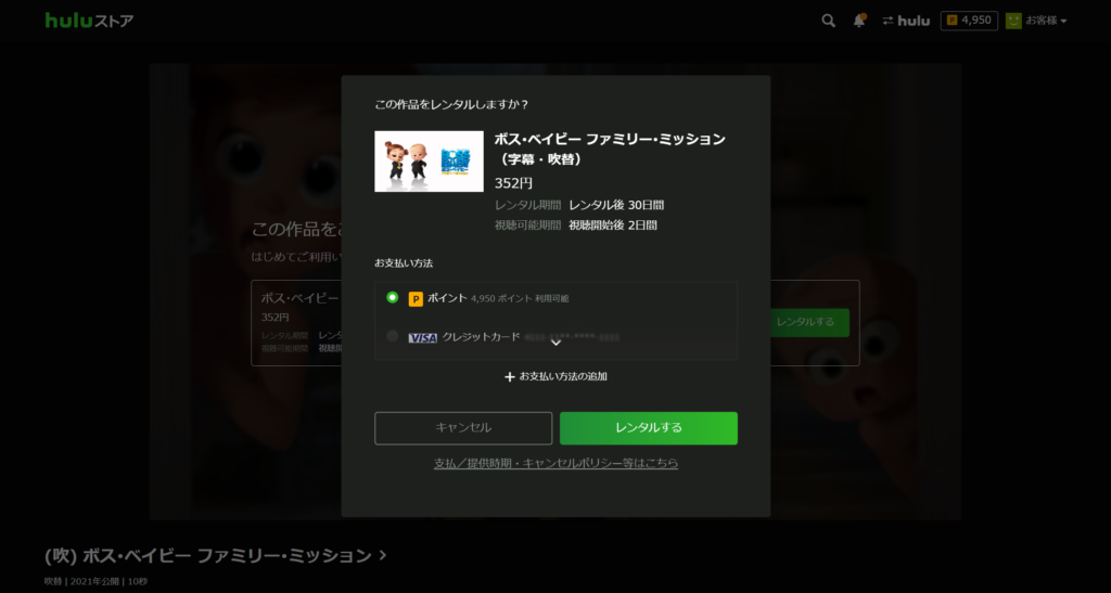 ・1ポイント=1円(相当)として、Huluストアの作品の購入・レンタルにご利用いただけます。
