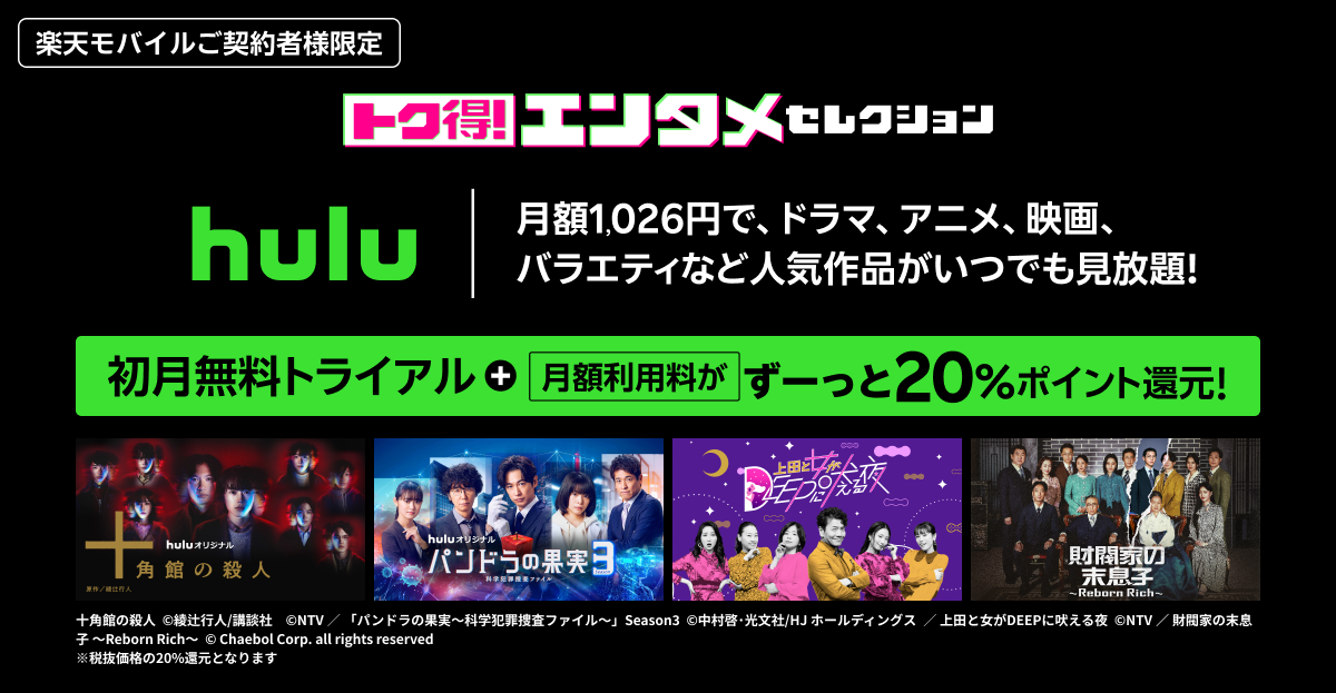 楽天モバイルが提供する「トク得!エンタメセレクション」において、Huluのオプション契約の提供を開始いたします。