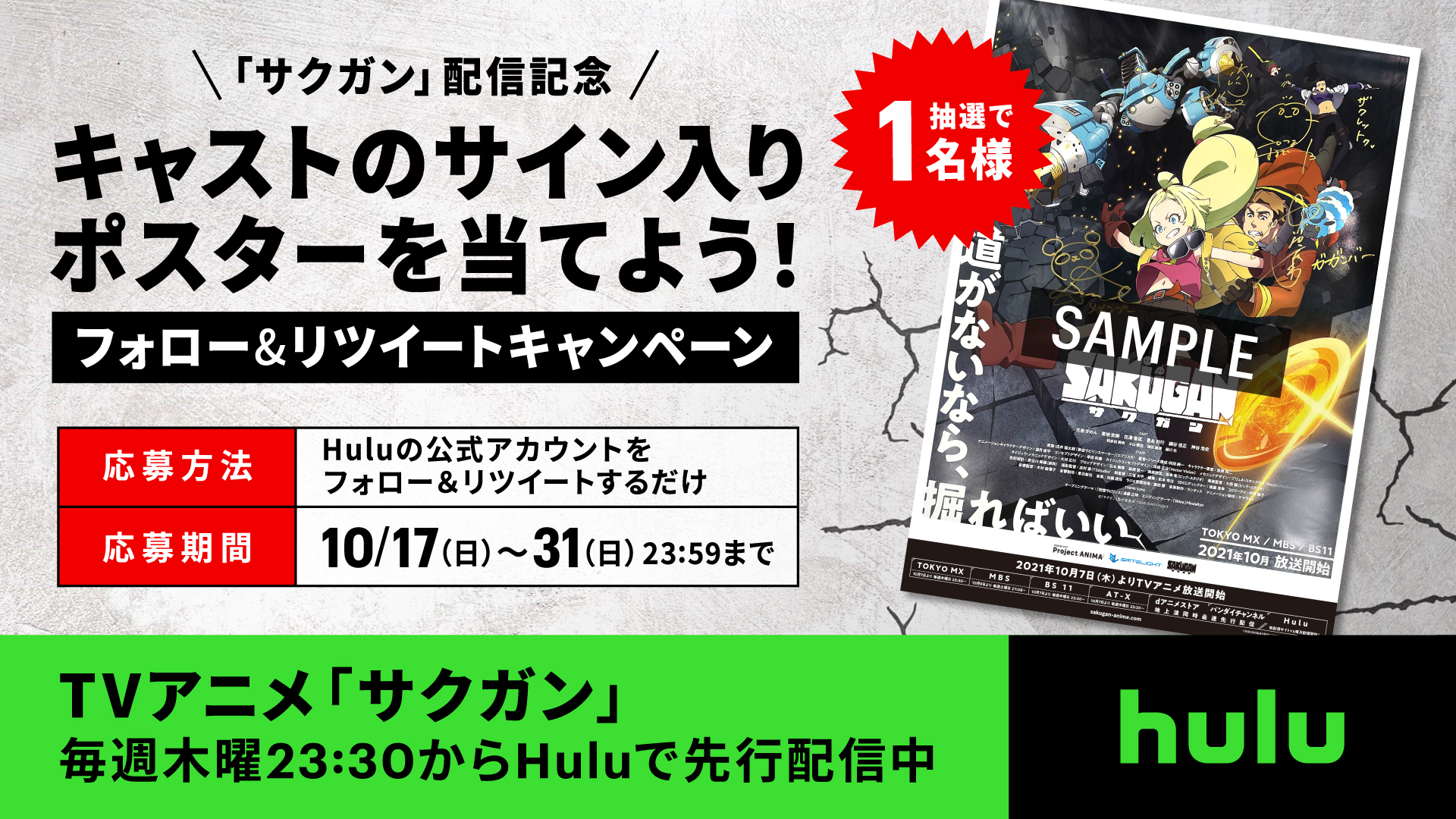 | ■注意事項■ ・抽選、当選通知は2021年11月上旬頃を予定しております。TwitterのDMでの当選通知後、指定の期間内にご連絡がつかない場合は、当選破棄とみなし他の応募者様の中から再抽選となります ・賞品の譲渡や販売は禁止いたします ・賞品の発送は日本国内に限ります ・13歳以下の方はご応募いただけません ・抽選は、当キャンペーン運営事務局が厳正に行います。当選や抽選の基準についてはお答えしかねます ・Huluサービスに付随して実施する各種懸賞キャンペーンは、Apple、Googleその他、当社以外の事業者と一切関係ありません |