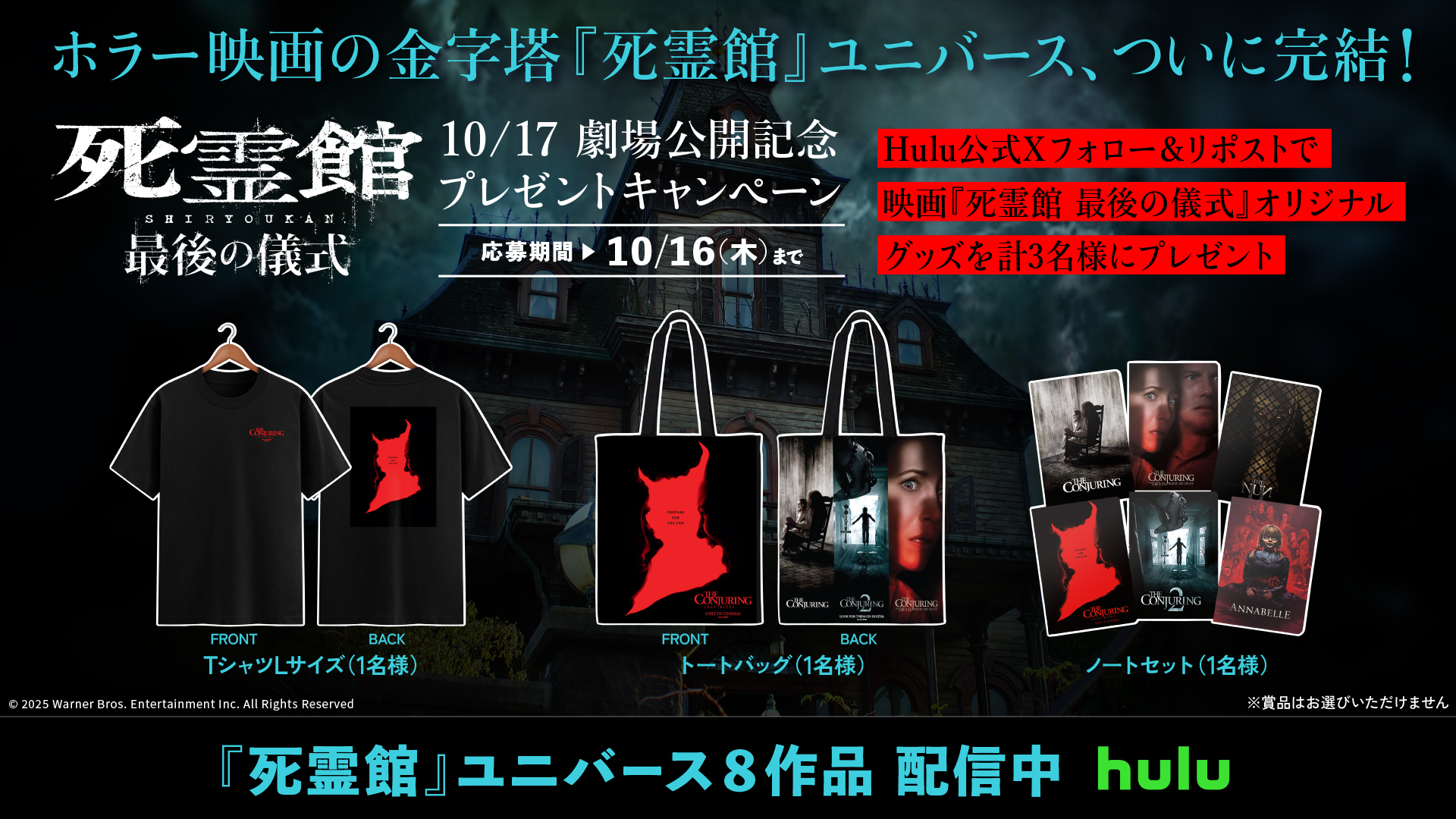 いよいよ10月17日(金)から劇場公開となる『死霊館 最後の儀式』。『死霊館』(2013)から『死霊館のシスター 呪いの秘密』(2023)までシリーズ8作品を配信中のHuluでは、待望の最新作公開を記念して、オリジナルグッズが当たるキャンペーンを実施中です。