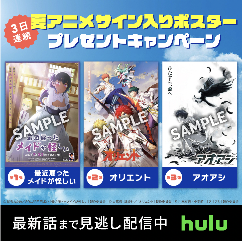 先行配信中の「最近雇ったメイドが怪しい」「オリエント」、2クール目を配信中の「アオアシ」メインキャストのサイン入りポスターを抽選でプレゼント。