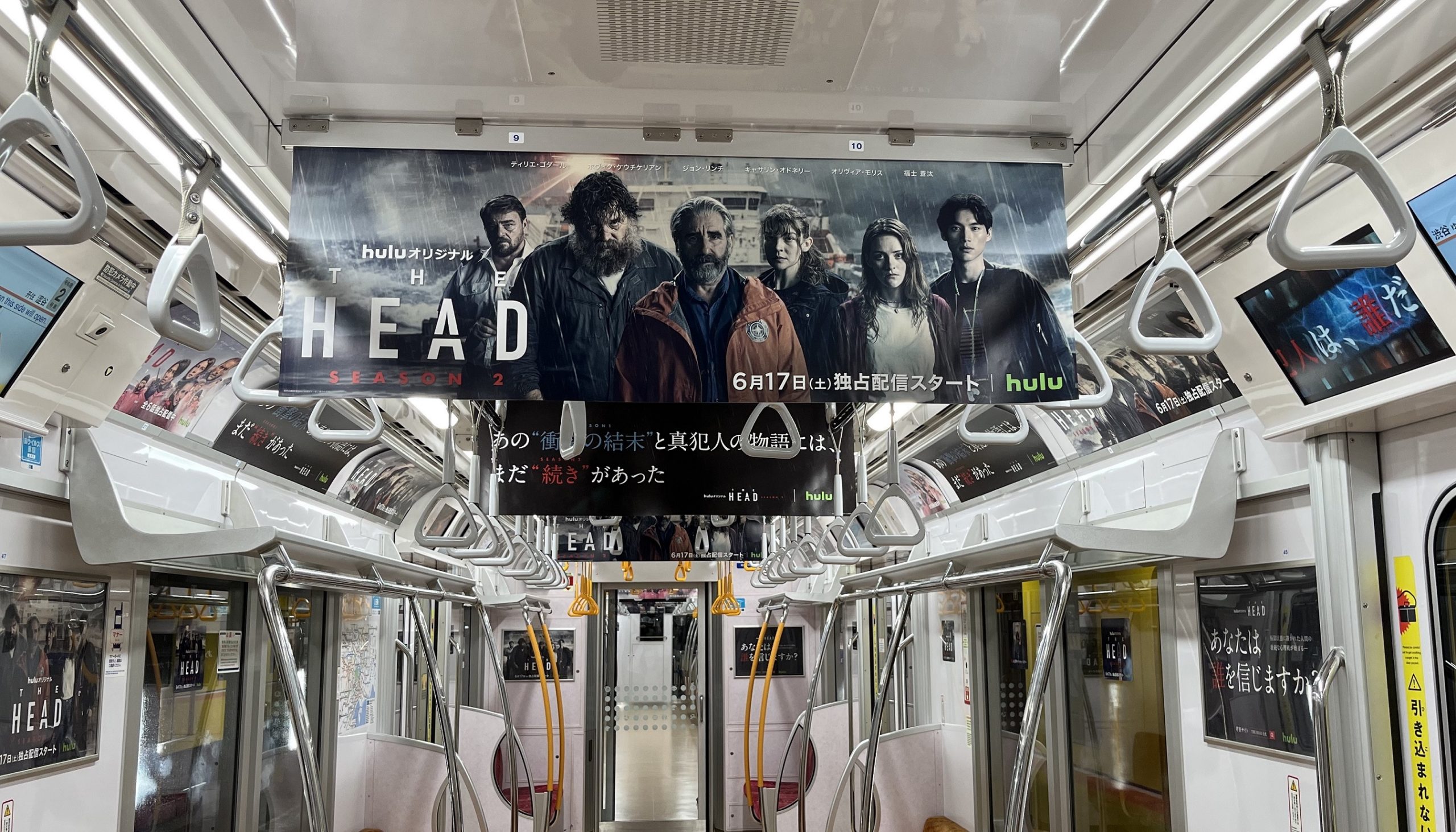 銀座線・丸ノ内線でそれぞれ1編成を丸ごと「THE HEAD」がジャックする車両内は、すでにHuluにて独占配信中の「THE HEAD」Season1と、17日(土)より配信開始するSeason2の両方のビジュアルを見ることができる仕様。中づりやドア横、まど上の広告に至るまで「THE HEAD」Season1&2のビジュアルやキャッチコピーで埋め尽くされ、シリーズを通して“THE HEAD”の魅力を楽しめる車両となっています。Season1で明らかになった“衝撃の結末”と真犯人の物語には続きがあり、Season2でどのような物語が展開されていくのか、”あなたは誰を信じますか?”という視点で、本車両の中で「THE HEAD」の世界感に浸ってみてはいかがでしょうか。