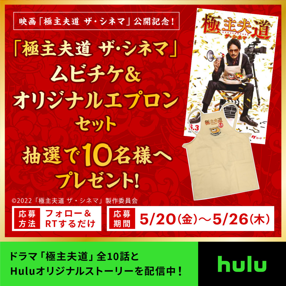 Hulu公式Twitterでは劇場公開を記念してプレゼントキャンペーンを実施、抽選で10名様にムビチケとオリジナルエプロンをセットでプレゼントいたします。奮ってご応募ください。