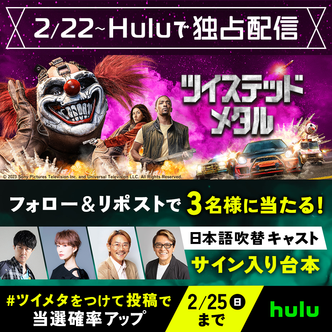 HuluではPlayStation®の伝説的ゲームを実写ドラマ化した「ツイステッド・メタル」シーズン1を2/22日(木)から見放題独占配信。配信開始直前を記念して、Hulu公式海外ドラマXアカウントにて豪華プレゼントキャンペーンを実施中!