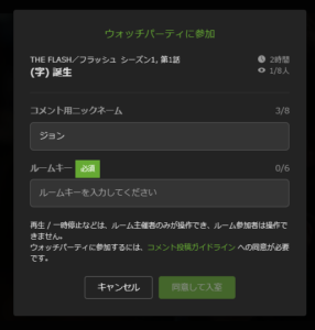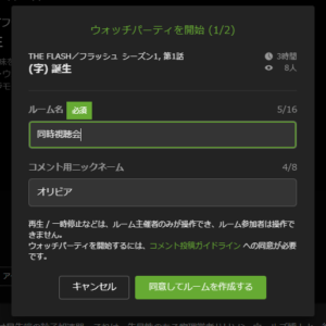 ウォッチパーティのルーム名、コメント用ニックネームを入力してルームを作成